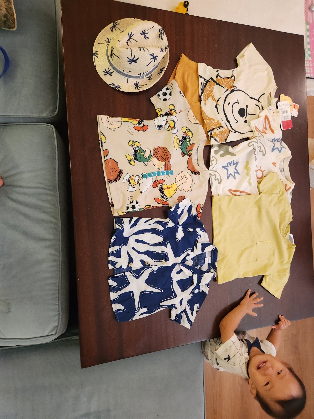 제가 오늘 구매한 옷들인데요. 총 850리라에요. 34000원에 티셔츠 5개, 바지 한 개에 모자까지 샀어요. 더 사고 싶었는데 한국에서 들고 온 옷들이 많아서 참았네요. 아기 옷 저렴하게 득템하세요!